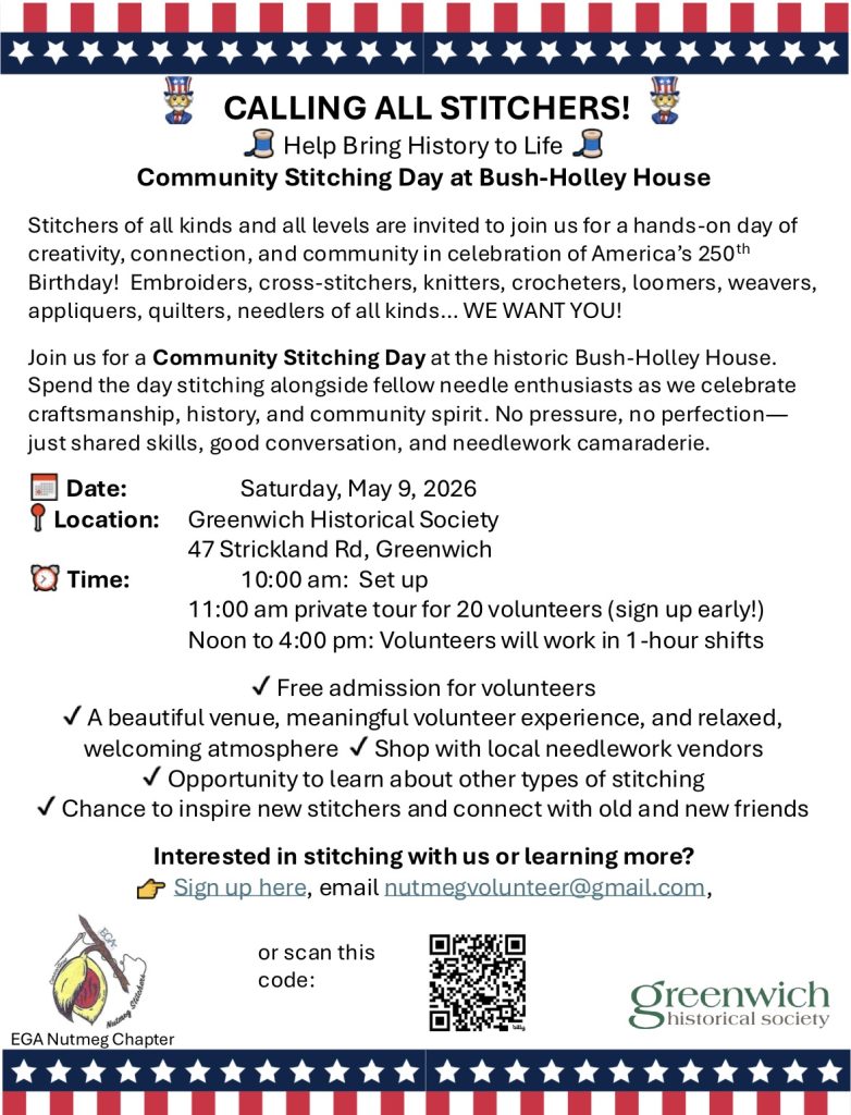 Nutmeg Stitchers Chapter of the Metropolitan Region Embroiderers’ Guild of America is delighted to announce a new and innovative program designed to bring attention to the needle arts. On May 9, 2026, in partnership with the Bush-Holley Museum in Greenwich, CT, we will be hosting a Community Stitching Day—a welcoming event where needleworkers of all types can gather, stitch, and enjoy one another’s company.